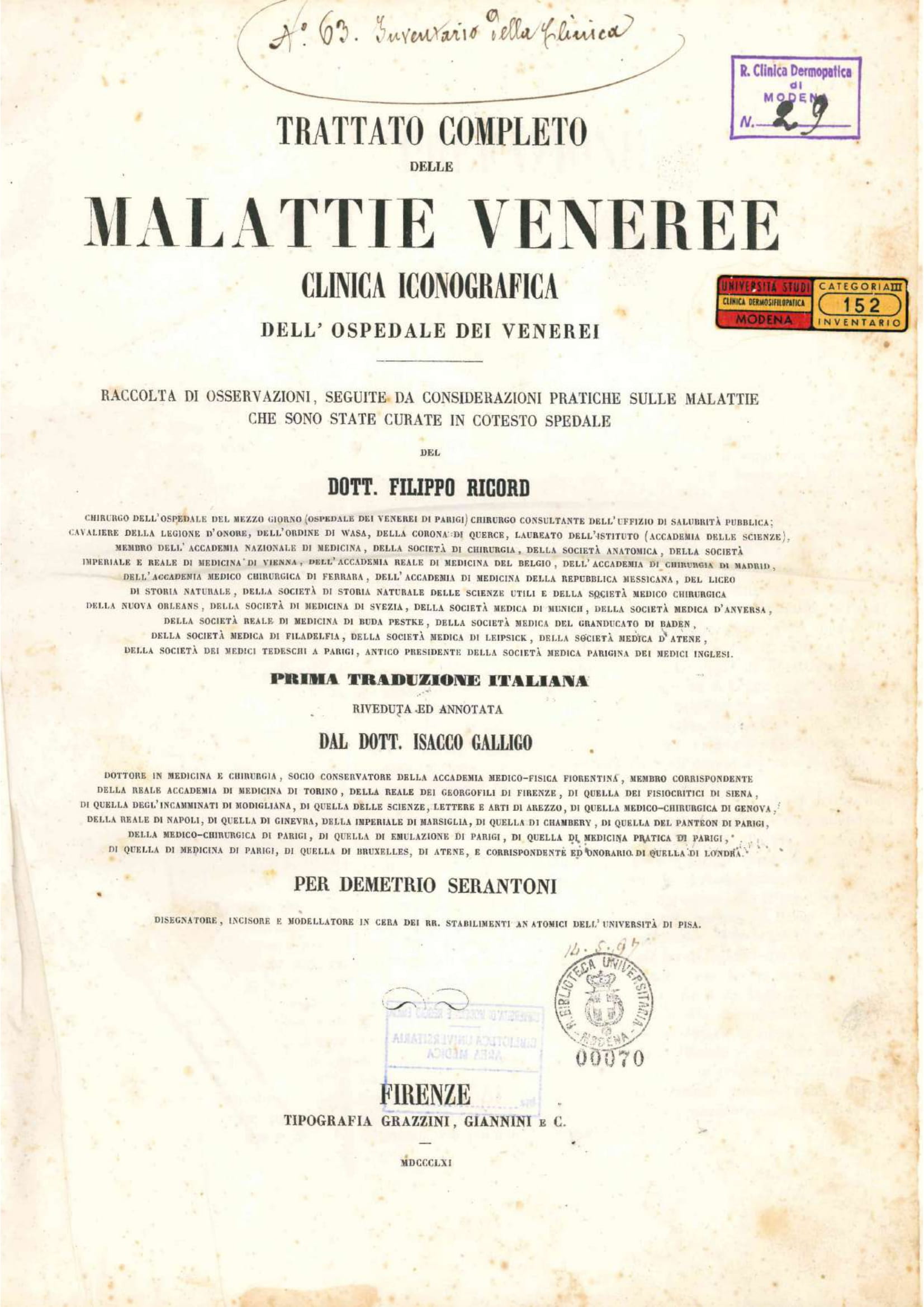 Presentiamo adesso il "Trattato completo delle malattie veneree: clinica iconografica dell'ospedale dei venerei", pubblicato in Italia nel 1861.